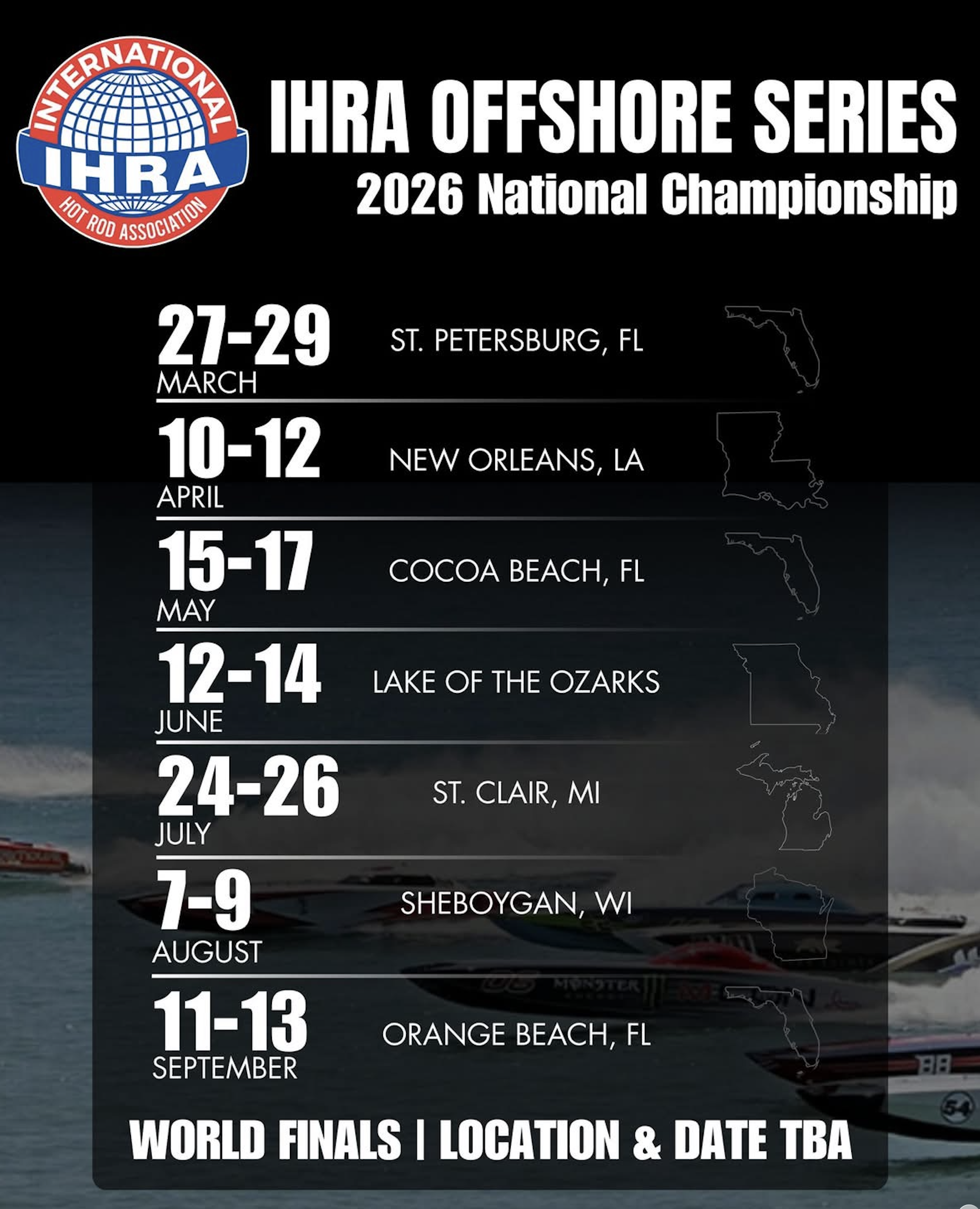 Here is the current 2026 IHRA Offshore National Championship Series schedule: